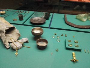 I grandi mutamenti e, in particolare, l’ideologia funeraria di VI-VII secolo caratterizzano la III sezione “Nuove genti, nuove culture, nuovi paesaggi”: la tarda antichità (IV-V sec.) e l’alto medioevo (VI-VII sec.) questi cambiamenti consistono in un revival della sepoltura abbigliata (il defunto veniva inumato vestito) e nell’utilizzo più frequente di oggetti di corredo. In Emilia-Romagna c’è una sostanziale continuità tra età romana e gota (Parma, Imola – ricco corredo da Villa Clelia, Bentivoglio-Bo) e una forte differenziazione tra territori soggetti ai Longobardi (Emilia) e ai Bizantini (Romagna, qui rappresentata da Faenza e da Rimini). In particolare i rituali di morte dei Longobardi appaiono strettamente connessi con i modi di trasmissione del potere nella società dei vivi: gli elementi di corredo sembrano scelti di volta in volta per ostentare prestigio sociale negoziato localmente da parte di quelle popolazioni che nel corso del VI e VII secolo acquisiscono una supremazia politica all’interno del territorio dell’impero. Tra i reperti, selezionati prevalentemente nei territori di Parma e Piacenza, emergono – per la chiara presenza di simboli identificativi di rango – gli straordinari corredi del sepolcreto di Spilamberto (Mo). Dalla tomba maschile 37 evidenti elementi del guerriero come la cuspide di lancia, l’umbone di scudo, la spatha, la lama di coltello, due fibbie; mentre dalla tomba femminile 62 appartenente a una donna di rango ecco la sella plicatilis (sgabello pieghevole) in ferro, il corno potorio in vetro, il guanto da combattimento con manico d’avorio e maglie di ferro (simbolo di potere), la fibula discoidale in lamina d’argento dorata con cammeo centrale, paste vitree e perle di fiume incastonate nella corona, la brocca in bronzo, la lucerna in ceramica invetriata, filo aureo, due conchiglie marine, bottiglia in vetro, vaghi in pasta vitrea, anello in bronzo, fibbia di cintura in argento, bicchiere fittile “a sacchetto”, pettine a doppia file di denti e spillone in osso.