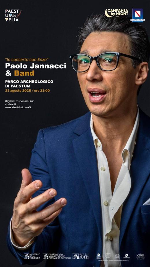 Sabato 23 agosto 2025, alle 21, al parco archeologico di Paestum (Sa), PAOLO JANNACCI & Band “in concerto con Enzo”, un omaggio intimo e autentico alla musica del padre Enzo, tra jazz e poesia. Tanti amici, fan e appassionati di musica gli hanno chiesto più volte di riportare sul palco le canzoni del padre Enzo, nella forma più sincera e autentica possibile. Paolo Jannacci ha deciso di farlo, accompagnando il pubblico in un viaggio musicale che mescola con delicatezza e forza il proprio repertorio jazz con i brani più amati di suo padre. Biglietti: https://www.vivaticket.com/it/ticket/paolo-jannacci-band-concerto-con-enzo/273472. I concerti sono inclusi nel biglietto serale d’ingresso ai Parchi (15 euro) e nell’abbonamento “Paestum & Velia”. Servizio navetta gratuito. Partenza alle 19 dal parcheggio dell’area archeologica di Velia. Rientro da Paestum alle 23.30. L’iniziativa è promossa dalla Regione Campania attraverso Scabec – Società Campana Beni Culturali e finanziata su Fondi di Coesione Italia 21–27 in collaborazione con i Parchi archeologici di Paestum e Velia, nell’ambito delle azioni di valorizzazione del patrimonio Unesco e Itinerari Culturali della Campania 2025.