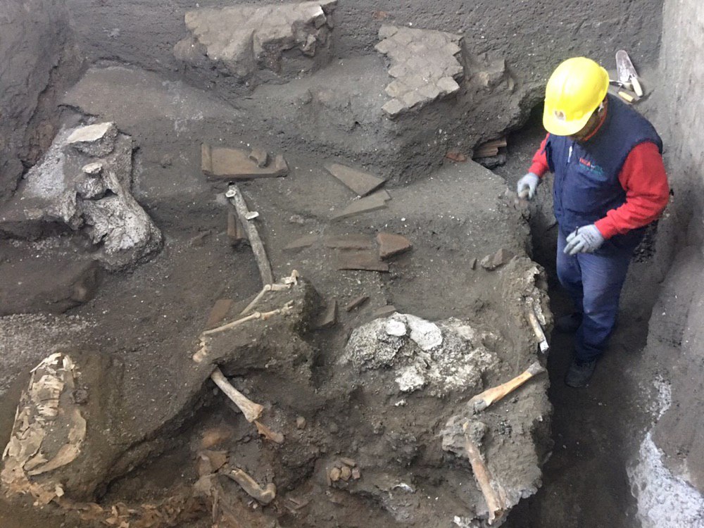 La scoperta dei due corpi. All’interno dell’ambiente è stata rilevata dapprima la presenza di vuoti nello strato di cenere indurita, al di sotto dei quali sono stati intercettati gli scheletri. Una volta analizzate le ossa – a cura dell’antropologa fisica del Parco che ne ha rimosso la più parte – si è proceduto alla colatura di gesso, secondo la famosa tecnica dei calchi di Giuseppe Fiorelli, che per primo ne fu inventore e sperimentatore. I calchi hanno restituito la forma dei corpi di due vittime in posizione supina. Entrambe erano state sorprese dalla morte durante la cosiddetta seconda corrente piroclastica, che nelle prime ore del mattino del 25 ottobre investì Pompei e il territorio circostante portando alla morte dei superstiti ancora presenti in città e nelle campagne. Questa seconda corrente era stata preceduta da una fase di breve quiete, forse di una mezz’ora, durante la quale i sopravvissuti sia a Pompei che probabilmente a Civita, uscirono dalle abitazioni nel vano tentativo di salvarsi. La corrente che lì investì fu però molto veloce e turbolenta, abbatté i primi piani delle abitazioni e sorprese le vittime mentre fuggivano su pochi centimetri di cenere, portandoli alla morte. Nel nostro caso è probabile che la corrente piroclastica abbia invaso l’ambiente da più punti inglobando e seppellendole nella cenere.