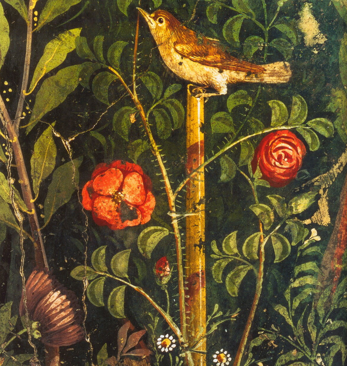 L’affresco della Casa del Bracciale d’Oro è tra le più accurate rappresentazioni di giardino di III stile, risalente al secondo venticinquennio del I secolo d.C. La cura dei dettagli con la quale è raffigurato il lussureggiante giardino fiorito, genera un effetto realistico che permette di riconoscere diverse specie di piante dell’epoca, l’oleandro, il viburno, il vilucchione, la palma, la rosa, l’edera variegata, oltre alla varie tipologie di uccelli, volteggianti o posati sui rami degli alberi, come il colombo, il colombaccio, la gazza ladra, il passero e la rondine. La decorazione rinvenuta negli anni ’70 in frammenti è stata ricomposta grazie ad un complesso intervento di restauro. Proprio Rosaria Ciardiello descrive l’affresco nei minimi dettagli: “L’oecus (la sala di rappresentanza) era decorato da bellissime pitture di giardino che, per l’ottimo stato di conservazione dei colori dell’intonaco, nonostante le condizioni di frammentarietà, cui si è ovviato con una attenta e curatissima opera di distacco e ricomposizione realizzata tra il 1979 e il 1983, si pongono al primo posto fra quelle ritrovate nelle città vesuviane. La decorazione, rinvenuta negli anni ‘70 in numerosi frammenti sotto il crollo della volta, è stata ricomposta a seguito di un delicato intervento di restauro. Essa riproduceva un bellissimo viridarium ricco di vari tipi di piante e ravvivato da erme marmoree ed uccelli di varia specie. Le pareti mostrano un giardino immaginario visto attraverso una grande finestra che si apre per tutta la sua larghezza. La fauna e la flora sono rappresentate con grande fedeltà. Tra gli uccelli si riconoscono l’alzavola, raffigurata mentre si leva in volo, l’usignolo, la cornacchia grigia, la garzetta. Tra le piante spiccano gli oleandri, i corbezzoli, il pino, le rose. Ad ogni elemento si accompagna anche un possibile significato simbolico. Sono state riconosciute, infatti, la palma da datteri, simbolo di vittoria e immortalità; l’alloro, sacro ad Apollo; il corbezzolo, simbolo di eternità; il papavero, caro a Demetra; il pino, simbolo di fecondità e sacro a Cibele; il viburno, consacrato nei trionfi; l’oleandro velenoso simbolo di morte, e la rosa, simbolo di amore e sacra a Venere. Allo stesso modo è stato possibile riconoscere anche nelle specie di uccelli raffigurati un significato simbolico, come nel caso della colomba sacra a Venere simbolo della fedeltà coniugale o della coturnice simbolo dell’amore. A sinistra di un bacino di fontana zampillante si riconosce l’usignolo poggiato su di una canna utilizzata come sostegno alle rose. Dall’alto pendono maschere dionisiache, in funzione di oscilla”.