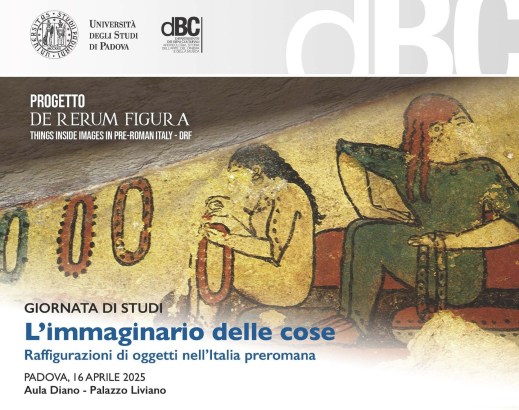 Mercoledì 16 aprile 2025, dalle 10, nell’aula Diano di Palazzo Liviano, in piazza Capitaniato 7 a Padova, giornata di studi “L’immaginario delle cose. Raffigurazioni di oggetti nell’Italia preromana” promossa dal dipartimento Beni culturali dell’università di Padova all’interno del Progetto PRIN “De Rerum Figura. Things inside Images in pre-Roman Italy – DRF”. Si inizia alle 10 con i saluti istituzionali della direttrice del dipartimento Giovanna Valenzano; alle 10.15, apre i lavori Silvia Paltineri dell’università di Padova. I parte: OGGETTI STATICI, OGGETTI IN MOVIMENTO, OGGETTI IN SCENA. Alle 10.30, Silvia Paltineri, Michele Cupitò (università di Padova), “Vesti, ornamenti e mobilio nella scena nuziale dello specchio di Castelvetro”; 11, Micol Masotti (università di Padova), “I carri nel corpus delle stele figurate di Padova preromana”; 11.30, Paolo Rondini (università di Pavia), Alberto Marretta (parco archeologico di Seradina-Bedolina, Capo di Ponte), “Il carro nel patrimonio figurativo protostorico camuno fra realtà e rappresentazione”; 12, Elena Pontelli (Scuola IMT Alti Studi Lucca), “Oggetti messi in scena: il caso delle “cose” appese nella pittura tombale etrusca”; 12.30, pausa pranzo. II parte: OGGETTI IN MUTAMENTO. Alle 14, Federico Prandoni (università di Pavia), “La coroplastica a stampo e le sue trasformazioni. Aggiunte e modifiche di elementi figurativi nelle versioni tarantine”; 14.30, Stefano Ordanini (università Statale di Milano), “Abiti e ornamenti nella coroplastica tarantina: indizi di mutamento semantico?”; 15, Andrea Giunto, Silvia Paltineri (università di Padova), “Attributi in mutamento nei votivi figurati di Villa di Villa… e oltre”; 15.30, discussione; 16, Maurizio Harari (università di Pavia), conclusioni; 16.30, chiusura dei lavori