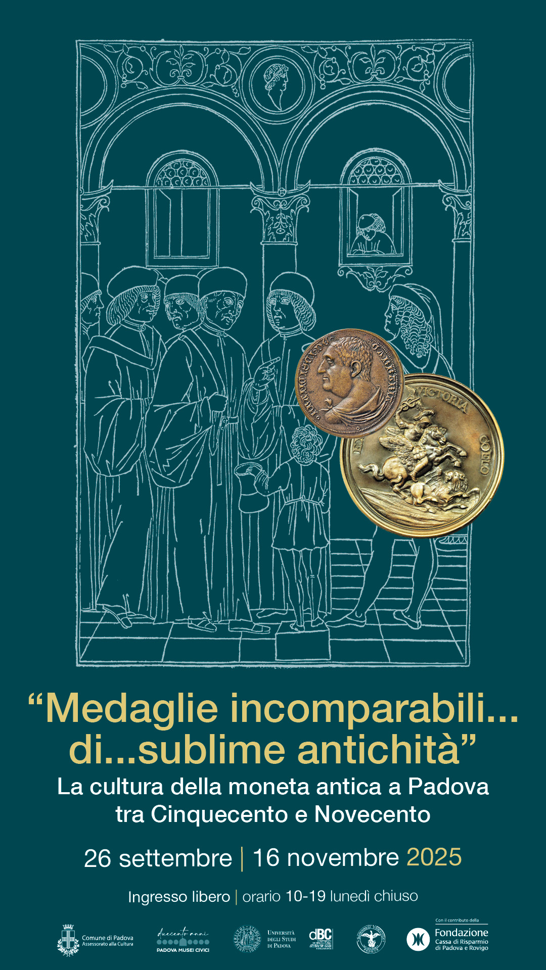 Mostra “Medaglie incomparabili…di…sublime antichità. La cultura della moneta antica a Padova tra Cinquecento e Novecento”. Da uno straordinario tesoro antico disperso al collezionismo numismatico del XIV secolo, fino alle collezioni che ancora oggi alimentano e rendono preziose le raccolte delle istituzioni cittadine. È forte il legame di Padova con il mondo della moneta antica. Ed oggi a testimoniarlo, portando alla luce anche preziosi documenti e reperti inediti, sono tre pilastri culturali della città: il Comune di Padova con i Musei civici, l’università di Padova con il dipartimento dei Beni culturali e la Biblioteca del Seminario vescovile di Padova. Insieme presentano la mostra “Medaglie incomparabili…di…sublime antichità. La cultura della moneta antica a Padova tra Cinquecento e Novecento”, realizzata con il contributo della Fondazione Cassa di Risparmio di Padova e Rovigo. L’esposizione, ospitata a Palazzo Zuckermann fino al 16 novembre 2025, propone di ripercorrere la tradizione numismatica del territorio illustrando con monete, medaglie, coni, manoscritti, fotografie e libri a stampa, non solo le collezioni ancora oggi presenti a Padova, ma anche il rapporto con la cultura padovana e veneta, ancora oggi radicata e vitale.
