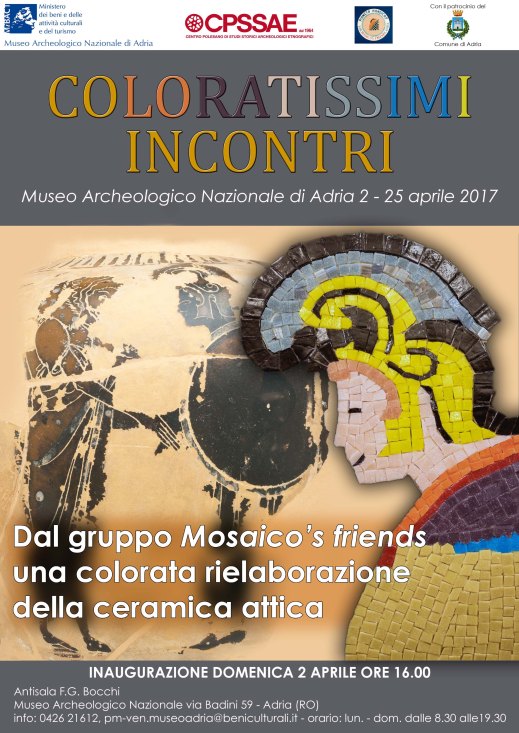 La locandina della mostra “Coloratissimi incontri” di Mosaico’s friends al museo Archeologico nazionale di Adria