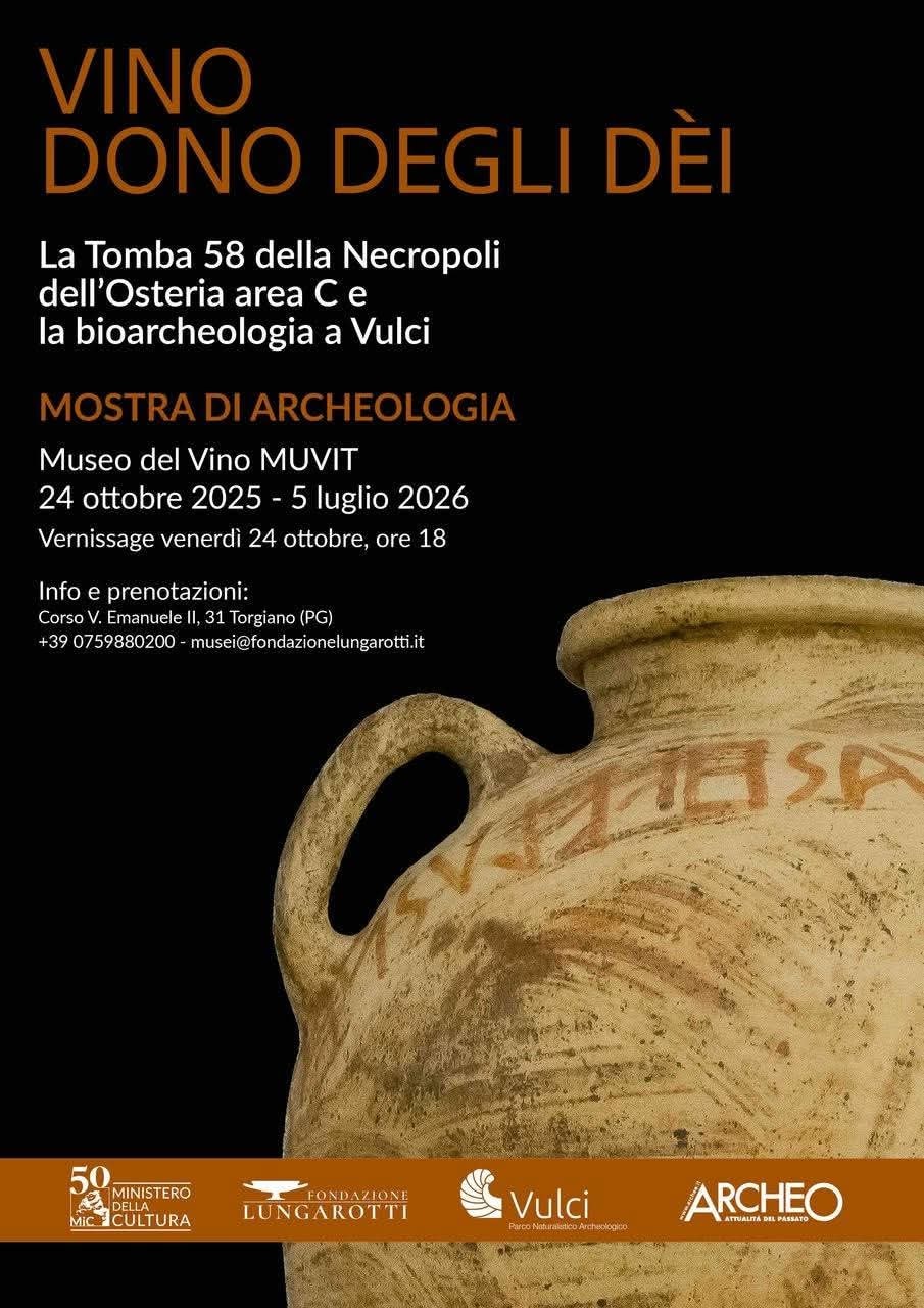 Un nuovo contributo alla conoscenza del rituale del banchetto funebre etrusco e soprattutto del simposio come uno status symbol di elevazione sociale e di riconoscimento del proprio rango da parte dell’aristocrazia etrusca, con la mostra “Vino, dono degli dei”, che sarà inaugurata venerdì 24 ottobre 2025, alle 18, e resterà aperta sino al 5 luglio del 2026, al museo del Vino – MUVIT di Torgiano (in provincia di Perugia in Umbria), nell’ambito del progetto “TraMusei” della Fondazione Lungarotti, su impulso della soprintendenza Archeologia Belle arti e Paesaggio per la provincia di Viterbo e l’Etruria meridionale e Fondazione Vulci, che vede anche la collaborazione della direzione generale Biblioteche.