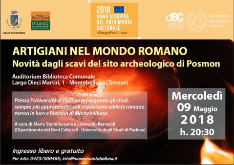 Nella conferenza “Artigiani nel mondo romano. Novità dagli scavi del sito archeologico di Posmon (Montebelluna-TV)” saranno illustrate le indagini interdisciplinari volte a ricostruire le caratteristiche architettoniche del complesso e a definire la funzione degli ambienti e delle installazioni, inserendoli in un più ampio panorama di studi sull’artigianato di età romana. La conferenza, organizzata dal Comune di Montebelluna-Museo Civico nell’ambito dell’Anno europeo del patrimonio 2018, in collaborazione con l’università di Padova, è rivolta a tutti i cittadini e alla comunità scientifica per divulgare l’importante patrimonio di conoscenza che questo sito archeologico continua a fornire. “Quest’iniziativa”, interviene Emanuela Gilli, conservatore del museo di Storia naturale e Archeologia di Montebelluna, “si collega a un più ampio progetto di valorizzazione del sito archeologico di Posmon che, oltre a comprendere nel giardino archeologico specifiche attività educative rivolte alle scuole e altre attività per la cittadinanza, prevede anche un nuovo allestimento nella sezione archeologica del museo civico”. E il sindaco Marzio Favero: “Questo ulteriore contributo di approfondimento scientifico sull’opificio di Posmon in relazione agli studi che si stanno compiendo sull’artigianato romano dell’epoca è un altro frutto della collaborazione fortemente voluta dalla direttrice del museo, Monica Celi, con la soprintendenza Archeologica e l’università, ed è reso possibile dalla nostra conservatrice, Emanuela Gilli, che si propone come interlocutore qualificato nei confronti delle più importanti istituzioni che si occupano di archeologia in Veneto e in Italia”.