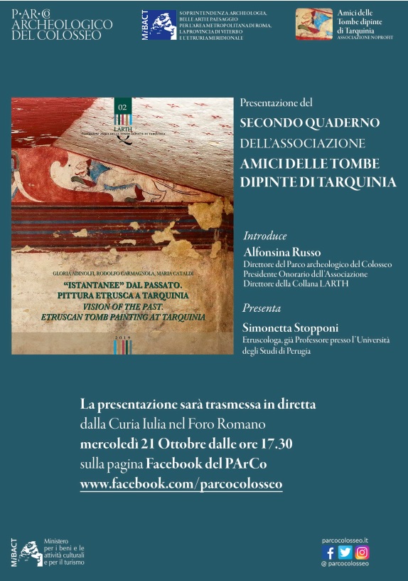 L’appuntamento è per mercoledì 21 ottobre 2020, alle 17.30, alla Curia Iulia al Foro Romano, per la diretta (in base alle indicazioni del DPCM 20 Ottobre 2020) sulla pagina Facebook del Parco archeologico del Colosseo (https://www.facebook.com/parcocolosseo/) della presentazione del secondo quaderno della collana LARTH dell’associazione Amici delle Tombe Dipinte di Tarquinia: “Istantanee dal passato. Pittura etrusca a Tarquinia” a cura di Gloria Adinolfi, Rodolfo Carmagnola, Maria Cataldi con appendice di Adele Cecchini. Introduce Alfonsina Russo, direttore del Parco archeologico del Colosseo, presidente onorario dell’associazione, direttore della collana LARTH. Presenta Simonetta Stopponi, etruscologa, già professore all’università di Perugia. La presentazione sarà occasione per ricordare l’instancabile opera di tutela e valorizzazione di uno dei curatori, Mariolina Cataldi, scomparsa un anno fa. L’associazione no profit ‘Amici delle Tombe Dipinte di Tarquinia’, di concerto con la soprintendenza Archeologia, Belle arti e Paesaggio per l’Area Metropolitana di Roma, la Provincia di Viterbo e l’Etruria Meridionale, promuove la tutela, la valorizzazione e lo studio degli ipogei dipinti di Tarquinia con il coinvolgimento di Enti, Istituzioni, Università e privati.