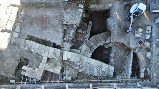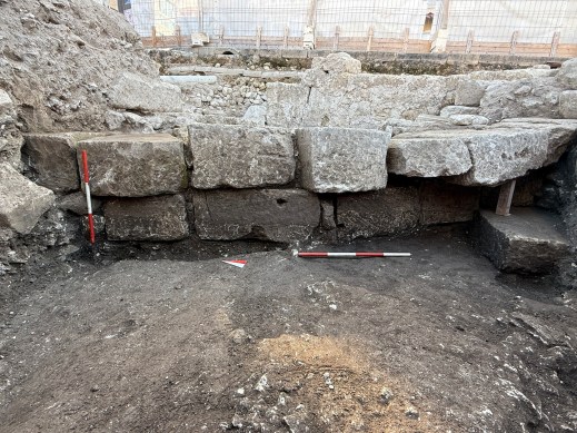 Lo scavo si è concentrato in un settore compreso tra piazza Sant’Oronzo e via Alvino, a breve distanza dalla porzione oggi visibile dell’anfiteatro romano. Già durante i lavori comunali di riqualificazione dei piani stradali eseguiti sul finire del 2024, la rimozione del basolato aveva fatto emergere parte della cavea, il muro anulare, i setti radiali e tre pilastri perimetrali appartenenti al monumento di epoca romana, il cui sviluppo planimetrico era ampiamente noto. Del tutto imprevisto e fin da subito oggetto di grande interesse è stato invece il rinvenimento di alcune possenti strutture murarie poste a ridosso dell’anfiteatro, fuori dal perimetro dell’edificio e immediatamente a nord di esso.
