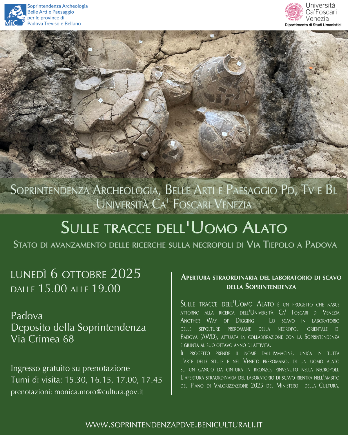 “Sulle tracce dell’uomo alato. Stato di avanzamento delle ricerche sulla necropoli di Via Tiepolo a Padova”: in occasione del Piano di valorizzazione dei luoghi della cultura 2025, lunedì 6 ottobre 2025, dalle 15 alle 19, apertura straordinaria del magazzino archeologico in via Crimea, deposito della soprintendenza Archeologia Belle arti e Paesaggio per le province di Padova Treviso e Belluno. Il visitatore verrà accompagnato alla scoperta delle sepolture preromane della necropoli orientale patavina, rinvenute in Via Tiepolo e Via San Massimo. Turni di visita alle 15.30, 16.15, 17, 17.45. Ingresso gratuito su prenotazione, max 25 persone per turno. Per prenotazioni inviare una e-mail a monica.moro@cultura.gov.it indicando il turno di visita scelto. Il progetto di scavo – “Sulle tracce dell’uomo alato” – nasce attorno alla ricerca dell’università Ca’ Foscari Venezia “Another Way of Digging – Lo scavo in laboratorio delle sepolture preromane della necropoli orientale di Padova”, attuato in collaborazione con la Soprintendenza e giunto all’ottavo anno di attività. Esso prende il nome dall’immagine, unica in tutta l’arte delle situle e nel Veneto preromano, di un uomo alato su un gancio di cintura in bronzo, rinvenuto nella necropoli.