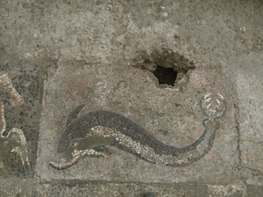 Il mosaico, di circa 30 mq, databile tra fine IV – inizio III secolo a.C., costituisce il piano pavimentale centrale di un lungo vano con piscina per il bagno caldo di un edificio termale, eretto su un edificio pubblico già esistente, munito di ambienti di rappresentanza e di servizio. Colpisce la particolare ricchezza dei motivi e dei soggetti decorativi scelti – delfini, draghi, ippocampi – e la loro composizione armoniosa con particolari tecnici quali l’uso di lamine in piombo per delineare i profili dei delfini. Lo schema compositivo del mosaico – realizzato con tessere policrome in pietra naturale, ceramica e terracotta di varie forme e dimensioni – pone al centro sei medaglioni con motivi floreali, delimitati da più listelli colorati, la cui particolare composizione dà luogo a una visione prospettica, mentre sul lato occidentale e meridionale sono disposti stretti e lunghi pannelli con figure di animali marini (draghi, delfini e ippocampo) affrontati per coppie. Un particolare decorativo è costituito inoltre, in prossimità dell’accesso alla sala, da una rosetta circolare a 12 petali.