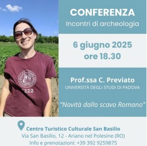 Ariano nel Polesine (Ro). A San Basilio per “Incontri di archeologia” conferenza di Caterina Previato (unipd), direttrice della campagna di ricerche, su “Novità dallo scavo romano” nell’ambito del “Progetto San Basilio. Alla riscoperta del passato”. E con “Scavi aperti” visita al cantiere con gli archeologi