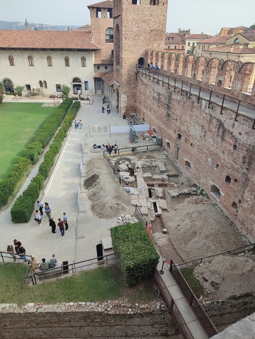 Obiettivo della ricerca è anche quello di approfondire la conoscenza del contesto urbano nel quale l’edificio insisteva, mettendo in relazione le nuove acquisizioni di scavo con i ritrovamenti di età romana, alto medievale e scaligera venuti alla luce nella zona, per chiarire la storia e l’evoluzione di uno snodo di fondamentale importanza del tessuto urbano cittadino. Il sito venne superficialmente indagato negli anni Sessanta del Novecento, quando una campagna di scavo rintracciò parte del perimetro dell’edificio, nel quale erano reimpiegati numerosi elementi di età romana ancora conservati in situ. Nonostante Carlo Scarpa avesse cominciato a ragionare sulla valorizzazione dei resti archeologici, questi vennero per la maggior parte interrati, e l’area rimase di fatto uno spazio non del tutto risolto all’interno del limpido disegno del cortile elaborato dall’architetto veneziano.