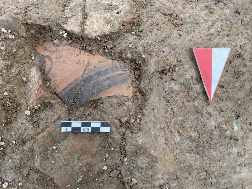 Frammento di ceramica a figure nere in corso di scavo sul sito preromano di San Basilio ad Ariano nel Polesine (foto unive)