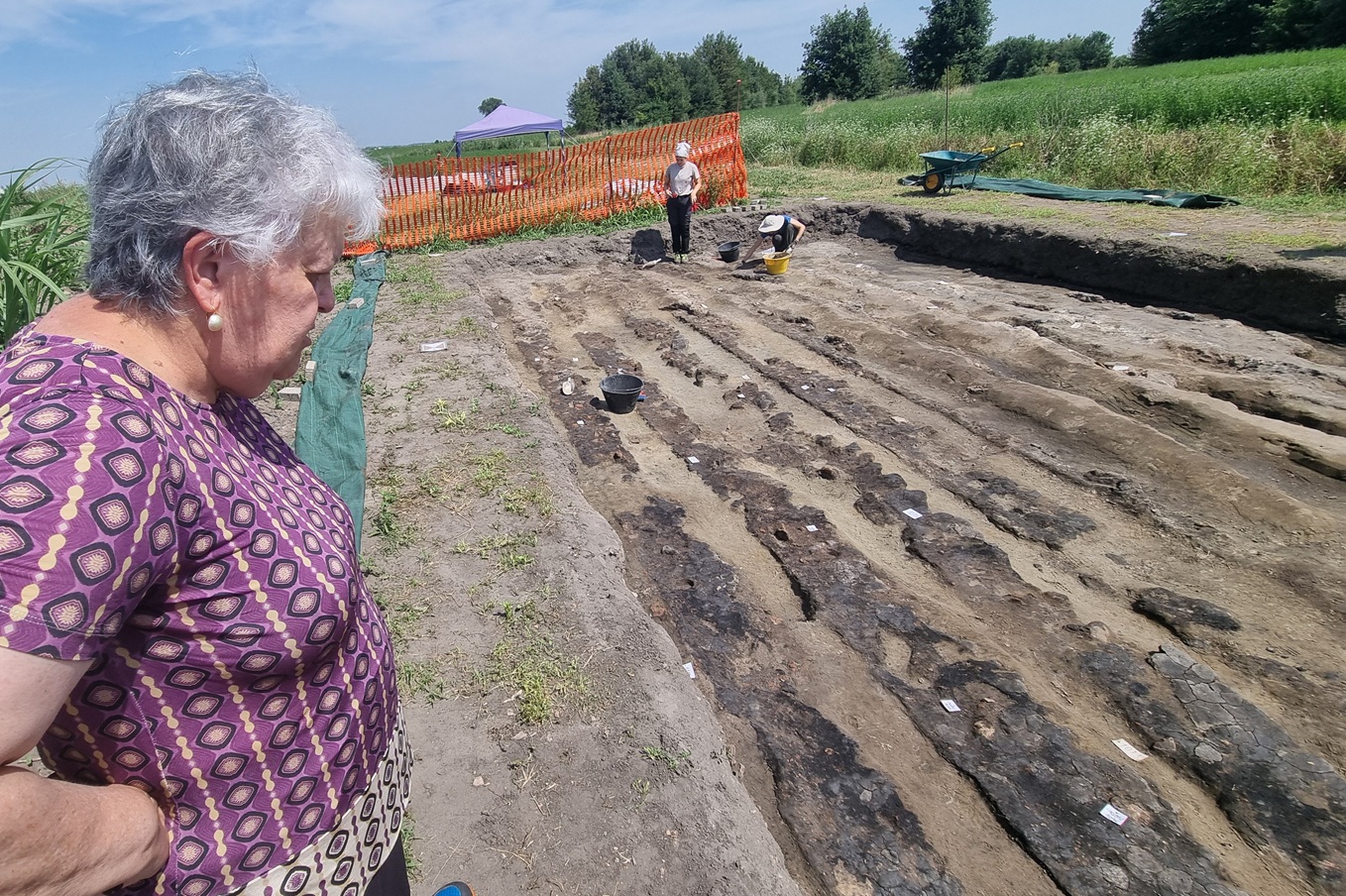 La prof.ssa Giovanna Gambacurta (UniVe) osserva la trincea settentrionale dello scavo preromano di San Basilio ad Ariano nel Polesine (foto graziano tavan)