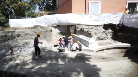 Archeologi al lavoro per ripulire la monumentale tomba in marmo a ridosso delle fondamenta del palazzo San Paolino a Pompei