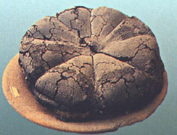 LIBUM (PIZZA AL FORMAGGIO) – Ingredienti: 6 etti di formaggio; 3 etti di farina di grano tenero; 150 g di semola. Preparazione: il “libum” si prepara tritando bene nel mortaio 6 etti di formaggio; aggiungere 3 etti di farina di grano tenero o, se si vuole più morbido, appena 1 etto e mezzo di semola, e mescolare bene il tutto. Con questo impasto si fa una pagnotta, la si appoggia su foglie di lauro e si cuoce col coppo lentamente, in forno caldo.