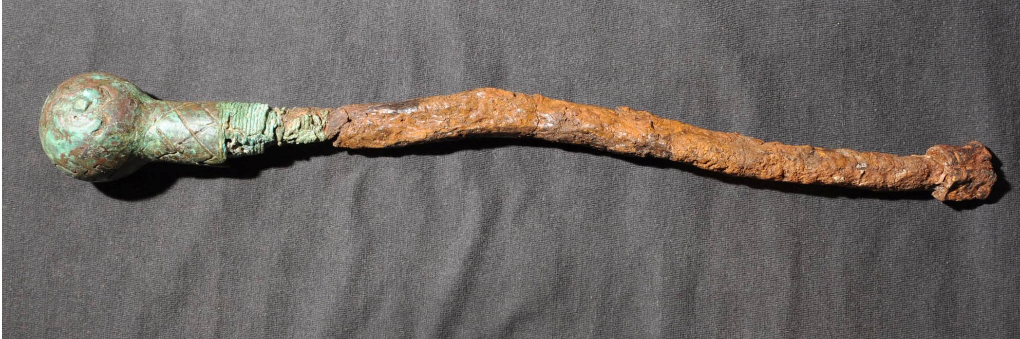 Lo scettro trovato nella Tomba 3: un bastone di legno di corniolo con pomo sferico di bronzo decorato con animali fantastici, contenuto in una scatola di legno di faggio.