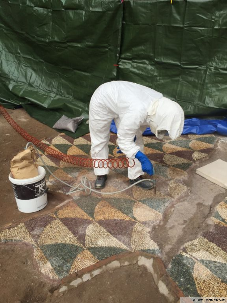 Il restauro del mosaico di circa 25 metri quadri, che nella sua interezza supera gli 80 metri quadri, curato da Marina Piranomonte e Anna Borzomati, si è articolato in diverse fasi: dopo una pulitura preliminare, si è preceduto al consolidamento del piano del mosaico e ad altri interventi finalizzati a evitare cedimenti. Ciò ha permesso il recupero di numerose tessere interrate. La pulitura definitiva è stata completata dalla stesura di un velo protettivo. “Il mosaico”, ha spiegato Borzomati, “era interrato, sono state realizzate diverse fasi di pulitura per rimuovere la terra. La presenza di vecchie stuccature di cemento, presenti nell’intervento precedente degli anni ’40, aveva creato dei difetti di degrado, soprattutto nella parte superiore, dove ci si è concentrati con una pulitura più specifica. Le mancanze sono state integrate con le tessere originarie, recuperate con la setacciatura della terra”. I lavori di recupero, ha spiegato Francesco Prosperetti, soprintendente speciale per il Colosseo e l’Area archeologica Centrale di Roma, permettono di tornare su un tema, cioè “la collaborazione con Bulgari, che già era intervenuta in passato alle Terme di Caracalla, ma che in questa occasione vediamo in una luce nuova, quella dell’applicazione dell’Art Bonus. Un meccanismo che incentiva in maniera finalmente efficace il rapporto tra le aziende, i privati, e la pubblica amministrazione. Fino a qualche anno fa il restauro delle opere d’arte era una prerogativa assoluta del pubblico. Investire nella bellezza non è solo un dovere della nostra amministrazione, ma si sta rivelando un elemento importante per le aziende private che, come Bulgari, sulla bellezza lavorano da più di un secolo”.