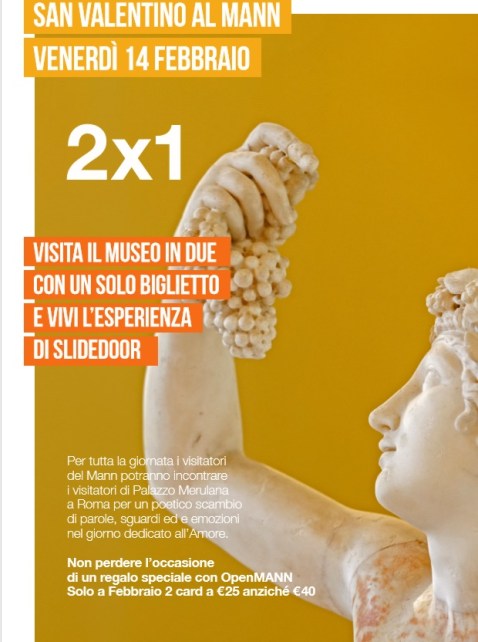 Il museo Archeologico nazionale di Napoli celebra l’amore. Venerdì 14 febbraio 2020 le coppie che accederanno al Mann usufruendo dell’opzione 2X1: per tutta la giornata, soltanto uno dei due visitatori pagherà il biglietto d’ingresso. Gli innamorati che sceglieranno di festeggiare San Valentino al museo potranno anche vivere l’esperienza SlideDoor, dedicata al tema della passione: passione per l’arte e per le parole, perché, nella sala del Toro Farnese, dinanzi al portale virtuale che collega il museo al Palazzo Merulana di Roma, saranno distribuiti dei cartelloni, che abbineranno i capolavori dell’Archeologico ai pensieri di famosi scrittori di tutti i tempi. Dall’altra parte della door interattiva, nella Capitale, i visitatori di Palazzo Merulana comunicheranno con i loro “omologhi” partenopei, condividendo le immagini di famose collezioni di arte contemporanea: un legame fatto di sguardi e reso possibile dalla tecnologia innovativa di SlideDoor. Attiva a San Valentino, come durante tutto il mese di febbraio, la promozione OpenMANN family: sarà possibile sottoscrivere e regalare un abbonamento annuale al Museo al prezzo scontato di 25 euro (al posto di 40). La card, valida per due adulti, darà anche diritto ad accedere gratuitamente ad uno dei laboratori sulla mostra “Lascaux 3.0”, organizzati da CoopCulture.