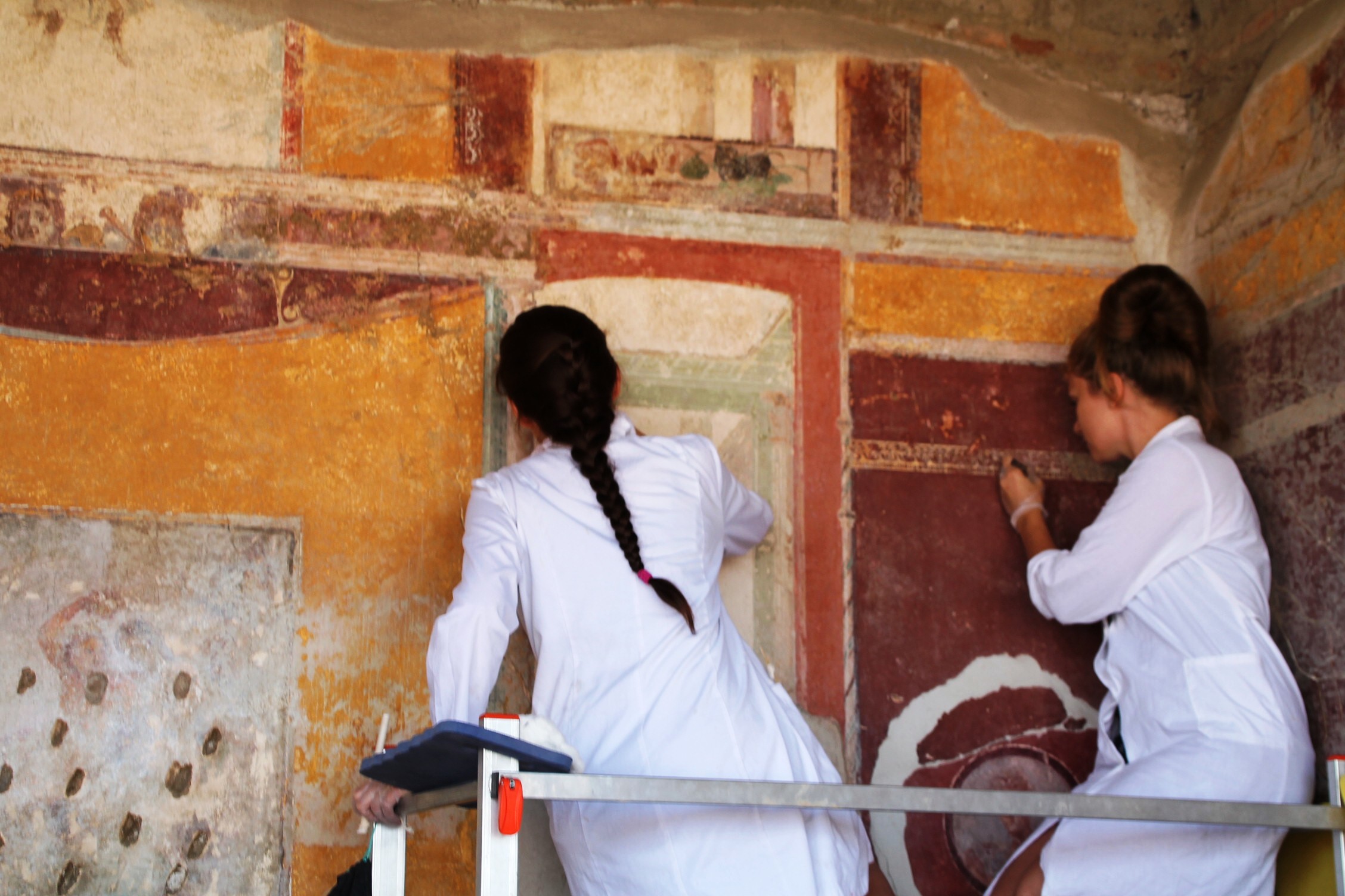 Restauratrici dell’Accademia delle Belle Arti di Varsavia al lavoro nell’ambiente 7 di villa Arianna a Stabia