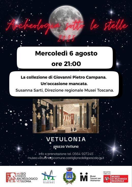Per la rassegna “Archeologia sotto le stelle 2025” al museo civico Archeologico “Isidoro Falchi” di Vetulonia conversazione archeologica “La collezione di Giovanni Pietro Campana. Un’occasione mancata” con Susanna Sarti, direzione regionale Musei della Toscana. Appuntamento mercoledì 6 agosto 2025, alle 21, in piazza Vetluna a Vetulonia. Ingresso libero. Il marchese Giovanni Pietro Campana costituì una delle più importanti collezioni private della prima metà del XIX secolo ed è stato una figura centrale, ma anche controversa, nella storia dell’archeologia e del collezionismo nell’Italia e nell’Europa dell’Ottocento. La sua incredibile collezione, dispersa a partire dal 1840 è in parte oggi visitabile nei grandi musei internazionali come il Louvre e l’Hermitage.