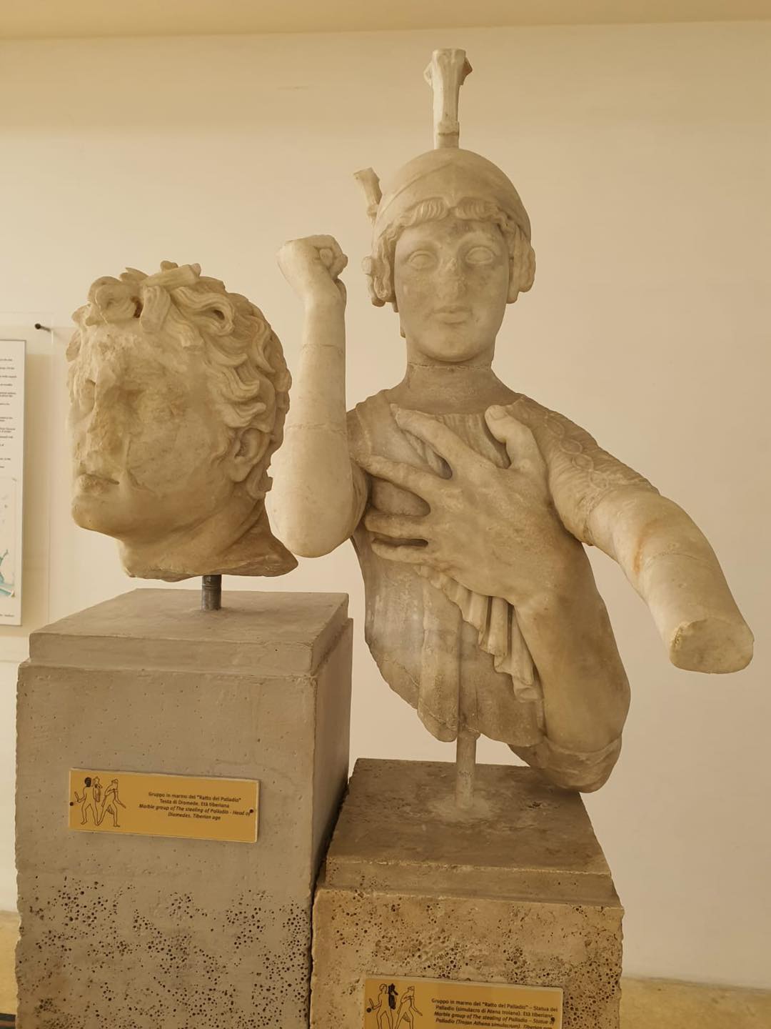 “Il gruppo del Ratto del Palladio – continuano – narra uno degli episodi che incisero sull’esito finale della guerra di Troia, ossia proprio il momento in cui l’immagine sacra di Pallade Atena viene rubata da Ulisse e Diomede, privando così Troia della sua protezione divina. La composizione conservata al museo Archeologico nazionale di Sperlonga immortala uno degli istanti più significativi della narrazione, ossia il balenare degli occhi e il vibrare della lancia, segni tramite i quali il Palladio rivela sé stesso, e impedisce ad Ulisse, che nasconde la spada nel mantello avvolto intorno al braccio, già pronto a sguainarla, la realizzazione del suo piano -dettato dall’invidia- di colpire alle spalle l’amico Diomede e di presentarsi ai Greci come portatore del Palladio”.