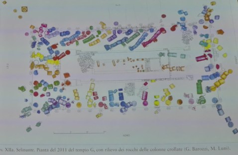 La mapppa del crollo del tempio G di Selinunte con gli elementi delle singole colonne colorati con colori diversi (foto Graziano Tavan)