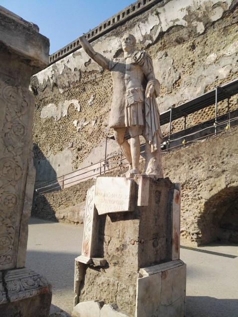 La rampa porta all’interno di questo spazio recintato che corrisponde a una sorta di zona sacra, una sorta di Heroon dove viene eroizzato uno dei personaggi di Ercolano nell’età dell’imperatore Augusto. “Si tratta di Marco Nonio Balbo, di cui qui vediamo il monumento funerario con la statua, ora qui esposta in copia, e l’altare funerario”, spiega Sirano. “All’interno di questo altare, al momento degli scavi archeologici, sono stati ritrovati anche i resti delle sue ceneri: all’interno di una olla e una pentola c’erano le ceneri e anche un pezzettino del dito della mano che riporta al cosiddetto “os resectum”, un tipico rito che avviene prima dell’incinerazione di un defunto. Marco Nonio Balbo apparteneva a una famiglia di Nocera di rango dei cavalieri che erano entrati in Senato. Faceva parte di quelle élite locali sulle quali l’imperatore Augusto contava per poter portare avanti il suo programma di rinnovamento di tutta l’Italia attraverso la soppressione di fatto dell’ordinamento repubblicano e l’inizio della monarchia”.
