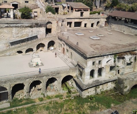 Le due terrazze artificiali, quella di Marco Nonio Balbo e quella del santuario di Venere, che si presentano alla vista dei visitatori che entrano nell’area archeologica di Ercolano (foto Graziano Tavan)