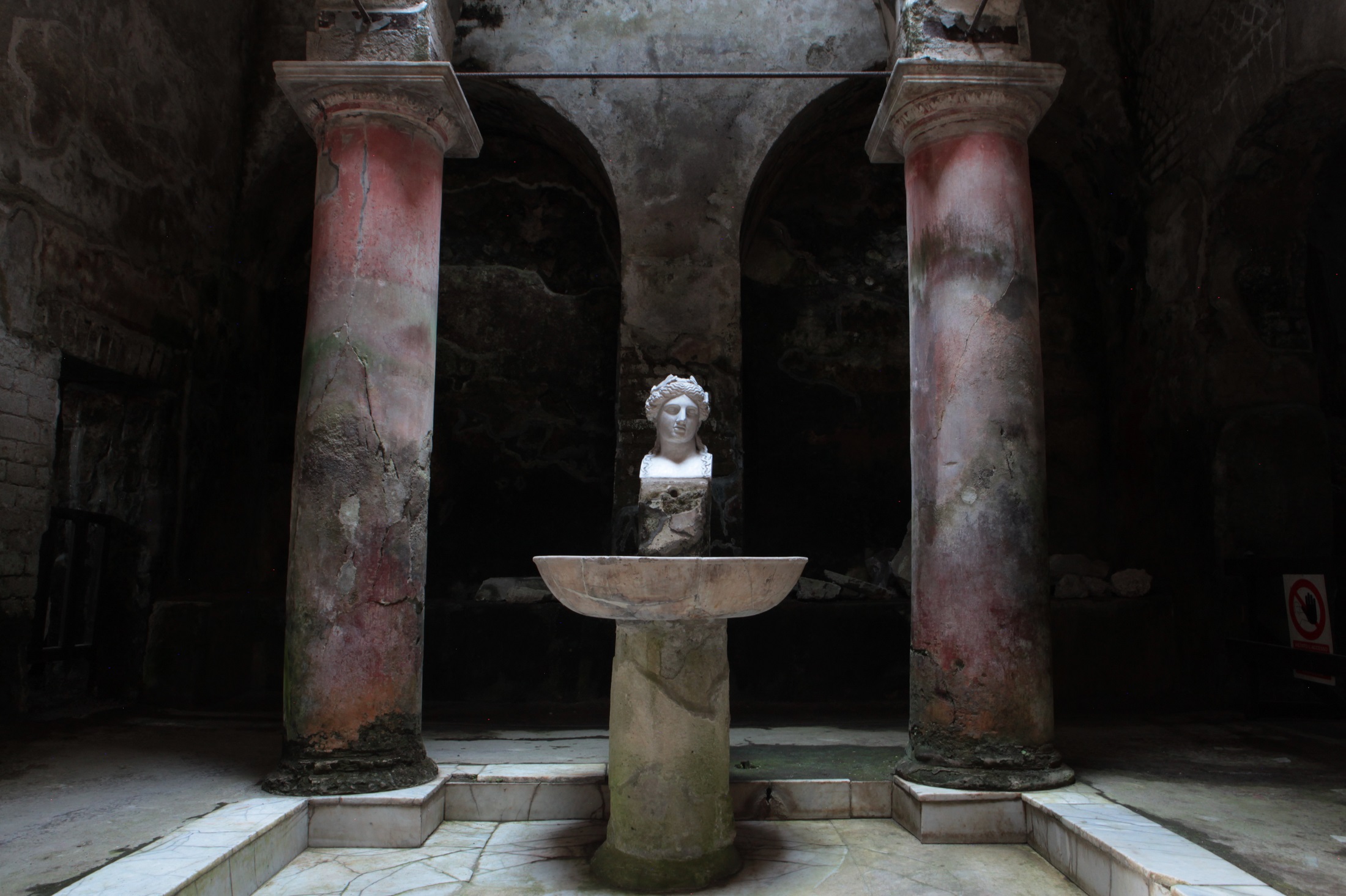 Il frigidarium delle Terme suburbane di Ercolano: si vede la vasca e, a sinistra, la porta con i resti del flusso piroclastico lasciati da Amedeo Maiuri (foto Guide Campania)