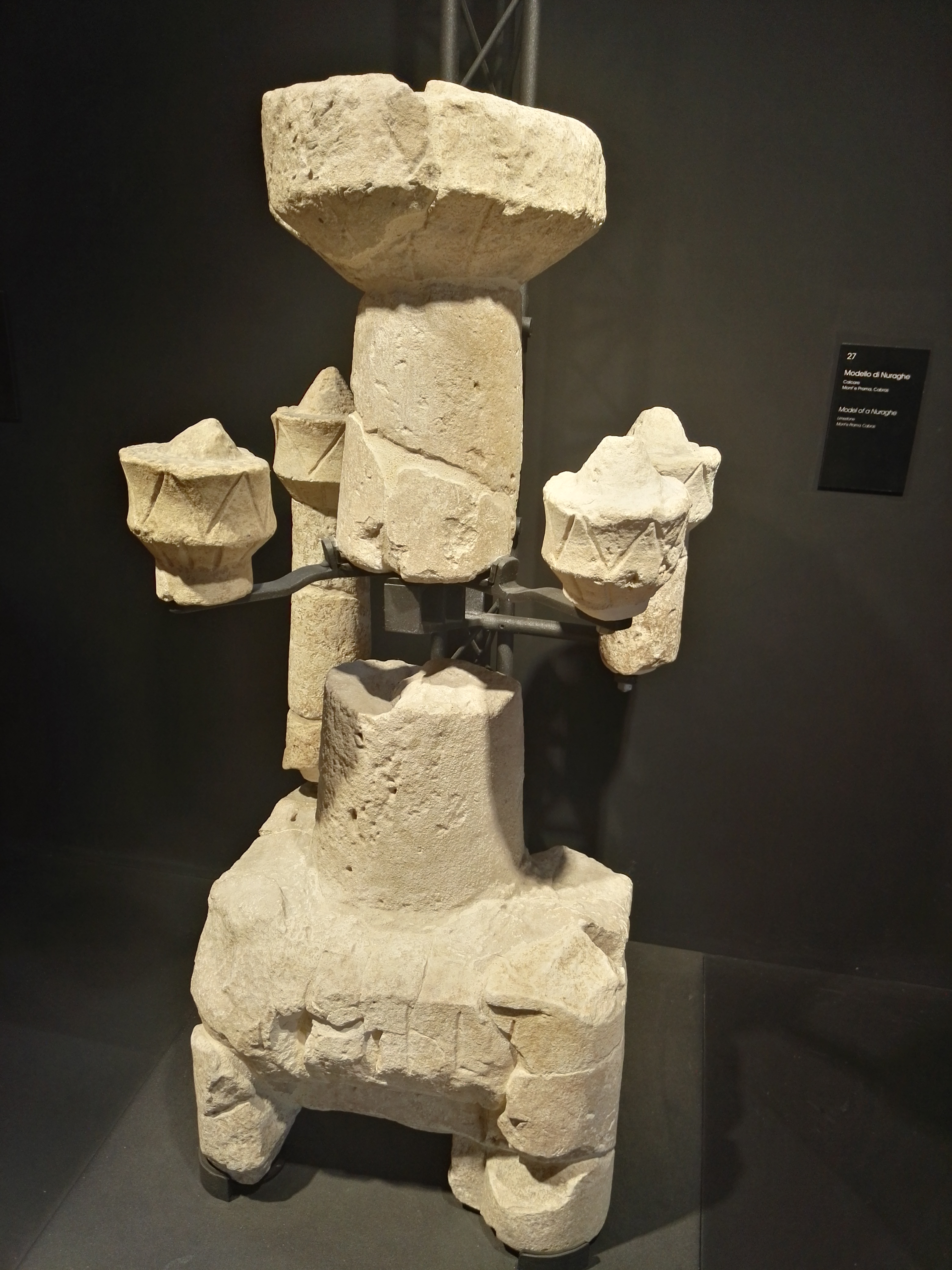 Quindi la mostra conduce nel cuore della civiltà nuragica, vero simbolo dell’unicità della Sardegna. Gli impressionanti nuraghi, costruiti in numero elevatissimo a partire dal 1600/1800 a.C. circa con blocchi di basalto, trachite e granito, di grande varietà tipologica e funzionale ma tutti accomunati dalle torri a tholos (sistema di copertura), sono stati al centro di importanti dibattiti e interpretazioni che hanno messo a fuoco le loro molteplici funzioni, rievocate in mostra dai manufatti esposti: l’alimentazione, l’agricoltura e allevamento, il controllo del territorio, le produzioni artigianali. Attorno ad essi, in molti siti, si sono sviluppati villaggi più o meno estesi, talvolta racchiusi da antemurali altrettanto imponenti, anche questi intervallati da torri.