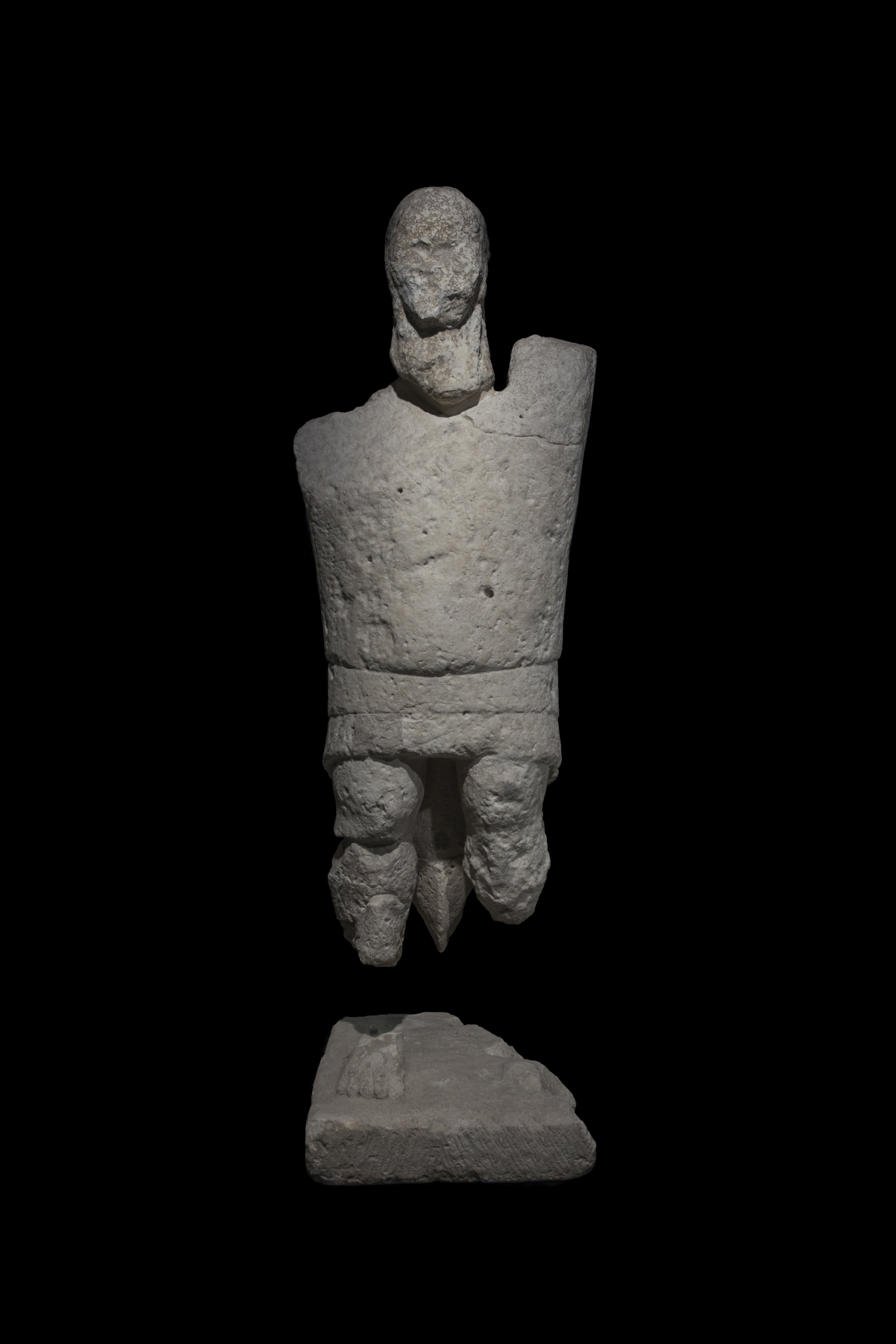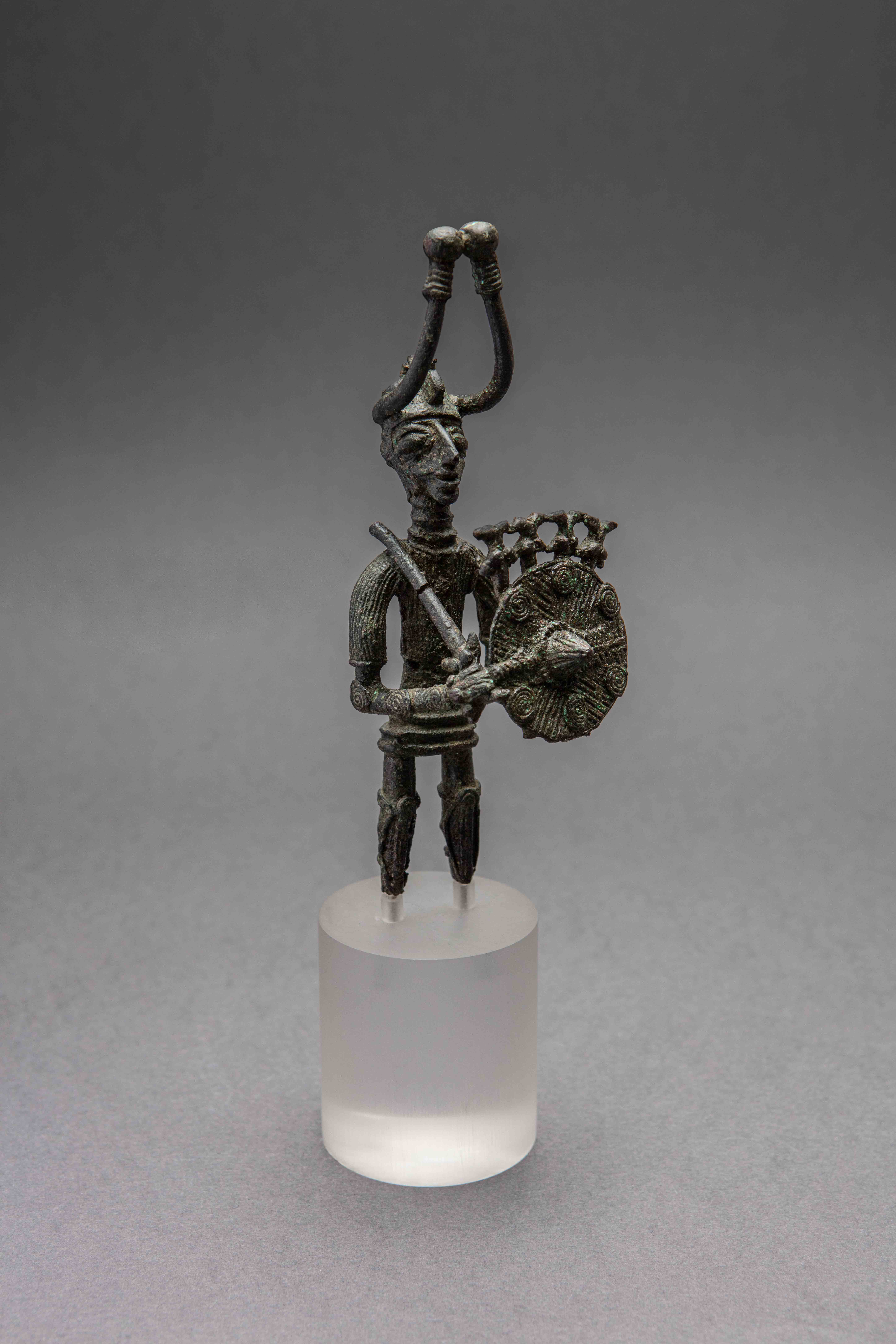 È questo il momento in cui alcuni gruppi emergono sugli altri e si formano le prime aristocrazie. A Mont’e Prama una di queste si autorappresenta e si autocelebra con un complesso scultoreo unico nel suo genere, composto da quasi 40 imponenti statue in pietra di Guerrieri, Arcieri e Pugilatori, oltre a modelli di nuraghe e betili. Per la nuova società, il tempo lontano degli eroi era oggetto di venerazione e di richiamo identitario. Evento irripetibile è il prestito di una delle celebri sculture di Mont’e Prama da parte del museo Archeologico nazionale di Cagliari per questa storica esposizione internazionale: un “Pugilatore” alto con piedestallo 190 cm e pesante circa 300 kg. Rinvenute in frammenti a partire dagli scavi del 1975-1979 e ricomposte grazie a interventi di restauro di eccezionale delicatezza e dai risultati sorprendenti (i primi nel 2007-2011), queste imponenti statue, nelle loro raffigurazioni schematiche realizzate secondo uno stile convenzionale d’impronta geometrica, non trovano paragoni nel variegato patrimonio artistico e monumentale della Sardegna e ancora sono aperte a diverse interpretazioni.