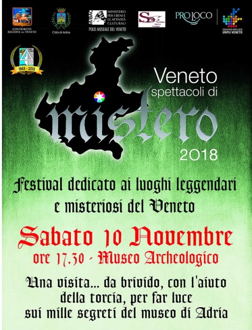 Chi è che ogni notte prende vita per bere di nascosto da un antico bicchiere? Chi è la fanciulla che grida, atterrita da un atroce delitto? Quale essere mostruoso ruba un vaso e si dà alla fuga? Domande su altrettanti segreti cui si potrà dare una risposta sabato 10 novembre 2018 partecipando a una visita… da brivido al museo Archeologico nazionale di Adria dove, con l’aiuto della torcia, si potrà far luce sui mille segreti custoditi tra le vetrine. La locandina dell’evento, in rigorosi caratteri gotici, attira l’attenzione e fa galoppare la fantasia. La rassegna regionale “Veneto spettacoli di mistero”, giunta alla decima edizione, approda per la prima volta al museo Archeologico nazionale di Adria. “L’idea è venuta alla Pro Loco di Adria che ci ha chiesto la collaborazione”, spiega la direttrice Alberta Facchi, “e noi abbiamo aderito al progetto con entusiasmo insieme all’associazione culturale Studio D”. Promosso dalla Regione Veneto, il Festival del Mistero è organizzato dalle Pro Loco aderenti all’Unpli, che danno vita a oltre duecento eventi finalizzati alla riscoperta delle tradizioni e degli aspetti più nascosti del patrimonio culturale del territorio. Il Festival, inoltre, rappresenta anche un’occasione per promuovere il turismo in una stagione tradizionalmente trascurata dai flussi tradizionali.