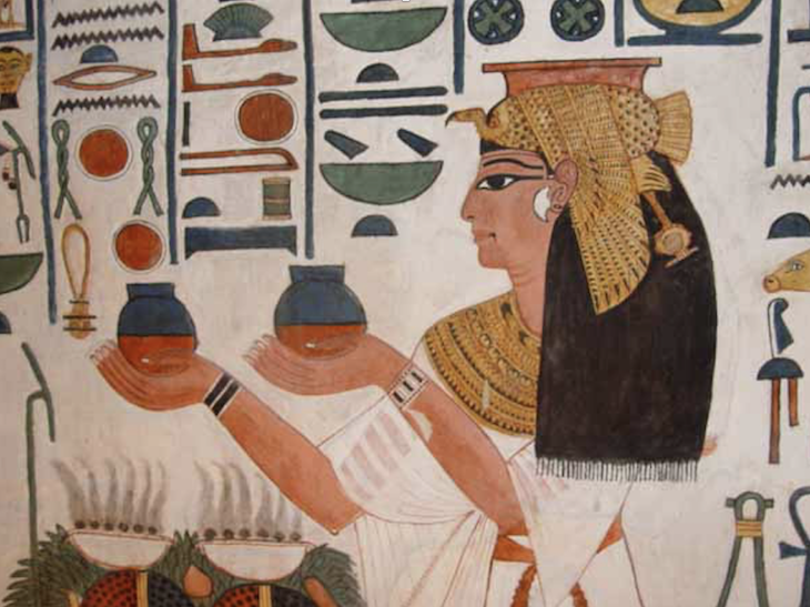Un ritratto della regina Nefertari con gli occhi truccati porge due vasetti per cosmetici (dipinto dalla tomba di Nefertari nella valle delle Regine)