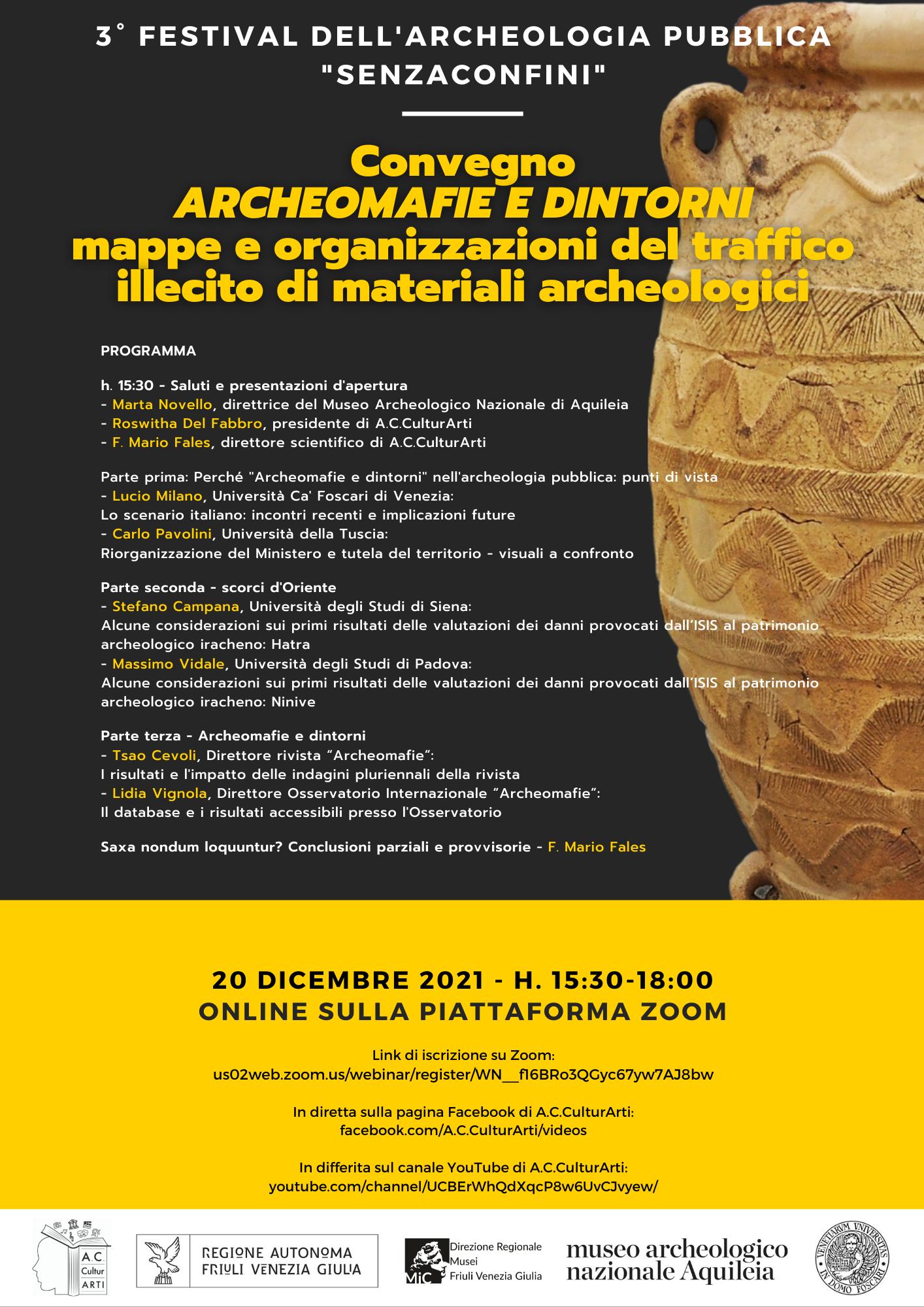 La sottrazione di opere d’arte e reperti archeologici non solo procura un danno patrimoniale allo Stato di inestimabile valore, ma depaupera anche ogni singolo cittadino. Questa forma di arricchimento illecito molto spesso è gestita da organizzazioni malavitose. Se ne parla lunedì 20 dicembre 2021, dalle 15.30 alle 18, nel webinar “Archeomafie e dintorni – mappe e organizzazioni del traffico illecito di materiali archeologici” organizzato dall’associazione A.C.CulturArti di Udine in collaborazione con il museo Archeologico nazionale di Aquileia ed è inserito nel programma del 3° Festival dell’Archeologia Pubblica “senzaConfini”, finanziato dalla Regione Autonoma Friuli Venezia Giulia. L’evento si tiene in diretta sulla piattaforma Zoom (iscrizione gratuita https://us02web.zoom.us/webinar/register/WN__f16BRo3QGyc67yw7AJ8bw) e sulla pagina Facebook di A.C.CulturArti (www.facebook.com/A.C.CulturArti/videos), in differita sul canale YouTube di A.C.CulturArti (https://www.youtube.com/channel/UCBErWhQdXqcP8w6UvCJvyew). Sono definite “archeomafie” le organizzazioni che operano nel campo degli scavi clandestini, del furto e del traffico illecito internazionale di reperti archeologici. Di questi argomenti di riconosciuto interesse, si occuperà il convegno “Archeomafie e dintorni”. L’evento, attraverso relazioni tenute da studiosi di fama internazionale, sarà in grado di concorrere all’aggiornamento degli operatori del settore, arricchendo le loro competenze e contribuendo a illustrare gli strumenti e metodi tuttora in atto per monitorare e contrastare la vasta gamma di atti e traffici criminosi connessi.
