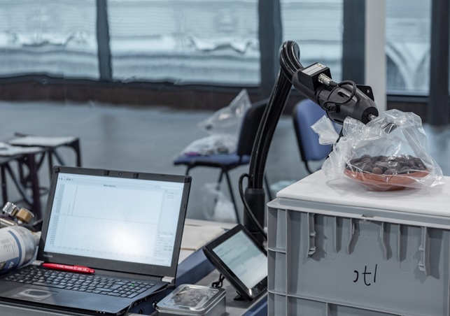 Lo spettrometro di massa SIFT-MS (Selected Ion Flow Tube-Mass Spectrometry) annusa il contenuto di una ciotola del corredo della Tomba di Kha e Merit al museo Egizio di Torino (foto Federico Taverni / museo Egizio)