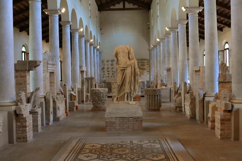 Sala 1 (Basilica).La sala ospita la maggior parte dei reperti provenienti da Concordia. I materiali sono esposti lungo le navate di sinistra e di destra, secondo un ordine cronologico progressivo. Nella navata centrale si distinguono frammenti di parti architettoniche di edifici pubblici (come parte dell’architrave riferita al teatro della città con iscrizione del I sec. d.C.); capitelli e rocchi di colonne; reperti della necropoli romana di Concordia che si sviluppava lungo la via Annia fuori dalla cinta muraria (stele architettoniche ad edicola – come quella della famiglia dei Cornelii -, cippi sepolcrali – come quello di F. Galla, detto anche del porcinarius, in cui sono rappresentati una coscia di maiale e gli attrezzi del mestiere -, frammenti di soffitti di camere funerarie – come quella a cassettoni, decorata al centro dalla scena di Ganimede rapito dall’aquila); spicca su tutti la statua femminile acefala in marmo di Luni, forse pertinente ad un ciclo statuario, in prossimità della quale sono esposti pavimenti musivi a motivi geometrici del I sec. d.C. e a motivi figurati (Tre Grazie) del III sec. d.C. Nella navata sinistra sono numerose le iscrizioni, sia pagane sia cristiane, relative a semplici cittadini o a notabili che nel centro cittadino occuparono cariche pubbliche: le iscrizioni sono incise su basi la cui collocazione museale lungo la navata serve per ricordare la loro collocazione originaria lungo le strade e negli spazi pubblici più importanti della città. Nella navata destra, infine, si trova la maggior parte dei reperti (sculture, sarcofagi, stele, iscrizioni databili tra la fine del IV ed il V sec. d.C.) rinvenuti nel “Sepolcreto dei militi” scavato tra il 1873 ed il 1876: è esposta una scelta dei 260 sarcofagi lì originariamente presenti e reinterrati.