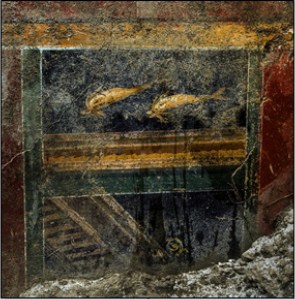 La Casa dei Delfini. Lungo la parte settentrionale del Vicolo delle Nozze d’Argento, il riprofilamento dei fronti di scavo ha permesso di scoprire la parte anteriore di alcune case con ambienti riccamente affrescati. Gli ambienti affrescati emersi proprio di fronte all’ingresso della Casa delle Nozze d’Argento, hanno suggerito il nome della Domus: “Casa dei Delfini” perché nell’ingresso (fauces), riccamente decorato su fondo rosso, compaiono due quadretti con una coppia di delfini, oltre a vari animali e a prospettive architettoniche. A Ovest dell’ingresso è stato indagato un ambiente nel quale è possibile riconoscere una più antica decorazione ad affresco, poi ricoperta da una più ricca decorazione in quarto stile. È possibile che la decorazione più antica sia anteriore al terremoto del 62, mentre l’ultima decorazione sia riferibile a lavori di ristrutturazione successivi a tali eventi. Più a Ovest, presso l’incrocio tra il Vicolo delle Nozze d’Argento e il Vicolo di Cecilio Giocondo sono stati individuati altri due ambienti affrescati, che si dispongono simmetricamente rispetto a un piccolo ingresso; l’ambiente a Est, già presentato, conserva una decorazione con eroti, mentre quello a Ovest presenta una fascia con una ricca decorazione a girali vegetali. La continuazione del vicolo di Cecilio Giocondo. Tra le insulae VI e VII della Regio V è stata indagata la parte iniziale del proseguimento del vicolo di Cecilio Giocondo verso Nord, dopo l’incrocio con il vicolo delle Nozze d’Argento. È ben visibile, in sezione, l’altezza dello strato di pomici che ha ricoperto la citta nella prima fase dell’eruzione. Nel punto della pavimentazione del vicolo in cui mancano i basoli è in corso di scavo un battuto pavimentale composto da terra misto a vario materiale di scarto (ossa animali, frammenti ceramici, un amo da pesca, ecc.). Sulla parete Est del vicolo è parzialmente visibile, tracciata con pittura bianca, una tabula ansata destinata verosimilmente a ospitare una scritta, forse un’insegna o un’iscrizione elettorale.