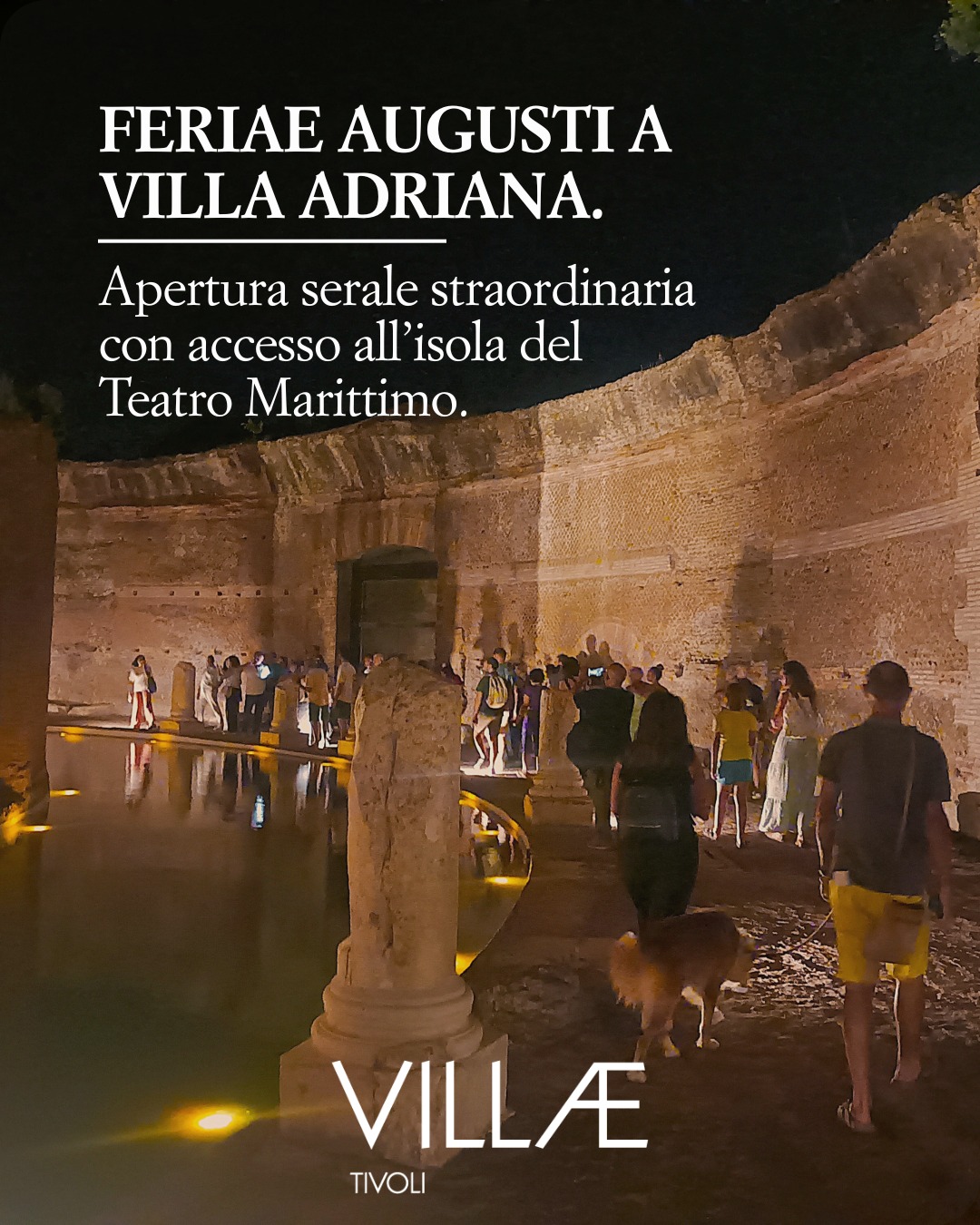 “Ferragosto sotto le stelle a Villa Adriana”: il 15 agosto 2025 Villa Adriana apre eccezionalmente in orario serale, dalle 19.30 alle 23 ((ultimo ingresso al sito 21.45; all’isola del Teatro Marittimo ore 22.15), con accesso straordinario all’isola centrale del Teatro Marittimo per la prima volta dopo i restauri della vasca e l’installazione della nuova illuminazione. Il Teatro Marittimo è uno degli edifici più rappresentativi di Villa Adriana, simbolo della straordinaria concezione architettonica. L’isola artificiale circondata da un bacino d’acqua e da un portico colonnato, conserva ancora i raffinati fregi figurati in marmo con soggetto marino che danno il nome al complesso: una vera e propria domus riservata all’imperatore Adriano, che qui poteva ritirarsi in solitudine, lontano dal clamore della corte. In occasione dell’apertura serale di Ferragosto il pubblico potrà provare l’emozione di accedere a questo luogo esclusivo e al contempo godere dello spettacolo unico della Villa illuminata. Passeggia tra le luci della residenza dell’imperatore Adriano e lasciati incantare dal silenzio e dalla bellezza di un luogo senza tempo: un’esperienza unica, tra storia e suggestione. Il percorso serale comprende anche Pecile, Tre Esedre, Vestibolo, Grandi e Piccole Terme, Canopo e Serapeo, Mouseia e Rocca Bruna. Ingresso con tariffazione ordinaria (salvo gratuità o agevolazioni di legge). Non occorre prenotazione. Accesso all’isola del Teatro Marittimo in piccoli gruppi, max 10 persone per turno.