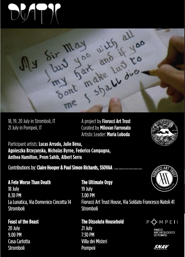 “La parabola della morte”: dall’isola di Stromboli a Pompei, alla Villa dei Misteri e alla Villa delle Colonne a Mosaico. La morte e il destino ineluttabile sono il tema di un intervento artistico che, partendo dall’isola di Stromboli, si conclude al Parco Archeologico di Pompei il 21 luglio 2019, nell’ambito di Volcano Extravaganza, Festival di arte contemporanea. A curare il festival, alla sua nona edizione, concepito e promosso dal Fiorucci Art Trust, ogni anno viene invitato un artista internazionale che – insieme al direttore del Trust Milovan Farronato – definisce un tema e seleziona gli altri artisti partecipanti. Il titolo di questa edizione, co-curata da Farronato con l’artista Maria Loboda, prende ispirazione da “Appuntamento a Samarra”, la parabola della morte inevitabile che apparve per la prima volta nel Talmud Babilonese (III-V sec. d.C.) nella storia mesopotamica del Sukkah 53°, come raccontato da W. Somerset Maugham nel 1933. L’oratore è la Morte e racconta: “Un mercante di Bagdad mandò il suo servo al mercato per fare provviste, dopo poco il servo tornò, pallido e tremante, e disse: ‘Padrone, proprio adesso mentre ero al mercato, sono stato spintonato da una donna nella folla e quando mi sono girato ho visto che era la Morte. Lei mi ha guardato e mi ha fatto un gesto minaccioso. Presto, prestami il tuo cavallo, cavalcherò via da questa città ed eviterò così il mio destino. Andrò a Samarra e là la Morte non mi troverà’. Il mercante gli prestò il suo cavallo, il servo lo montò affondando i suoi speroni nei fianchi dell’animale e, veloce quanto il cavallo riusciva a galoppare, scappò. Quindi anche il padrone andò al mercato e mi vide in mezzo alla folla, venne da me e disse: ‘Perché hai fatto un gesto minaccioso al mio servitore quando l’hai visto stamattina?’, ‘Non era affatto un gesto di minaccia’, disse, ‘era solo un sussulto di sorpresa. Ero stupito di vederlo a Bagdad, perché stasera avevo un appuntamento con lui a Samarra’.”