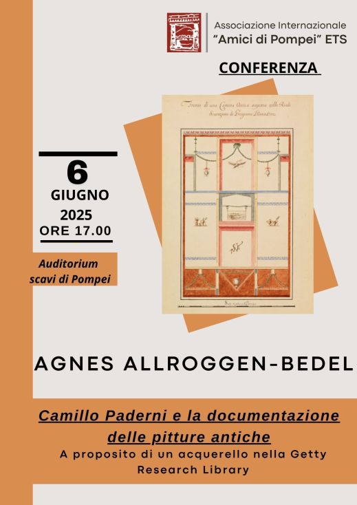 Il mese di giugno 2025 si apre a Pompei con un incontro promosso dall’associazione internazionale Amici di Pompei ETS. Venerdì 6 giugno 2025 alle 17, all’’Auditorium degli Scavi di Pompei, la conferenza dell’archeologa Agnes Allroggen-Bedel “Camillo Paderni e la documentazione delle pitture antiche. A proposito di un acquerello nella Getty Research Library”. La conferenza tratta di un acquerello, conservato alla Getty Library, che illustra una tipica decorazione parietale romana. Due incisioni senza alcun riferimento all’oggetto raffigurato, pubblicate nel 1808, ritraggono due pareti della stessa stanza della Villa San Marco a Stabia, di cui una è raffigurata nell’acquarello. L’acquerello e le incisioni documentano il contesto originale prima dello stacco di singoli motivi e permettono di identificare le pitture oggi conservate al museo Archeologico nazionale di Napoli. Gli studi sulle procedure di commissione dei disegni per la pubblicazione delle “Antichità di Ercolano” e sull’uso di monogrammi da parte degli incisori e dei disegnatori della “Scuola di Portici” permettono di identificare Camillo Paderni come autore dei disegni per le due incisioni e l’acquerello. Ciò completa il profilo della personalità di Paderni, disegnatore di pitture antiche prima a Roma e poi a Napoli, dove divenne il direttore del Museo Borbonico, uno dei più prestigiosi dell’epoca.
