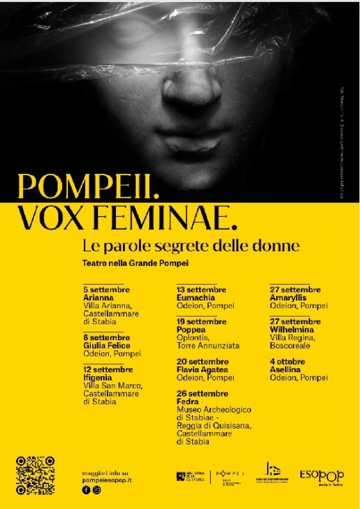 Arianna, Giulia Felice, Ifigenia, Eumachia, Poppea, Flavia Agatea, Fedra, Wilhelmina, Amaryllis, Asellina, sono i personaggi dell’inedito progetto teatrale POMPEII. VOX FEMINAE. Le parole segrete delle donne”, che accompagna e amplifica il racconto della mostra “Essere donna nell’Antica Pompei” (nella Palestra Grande, visitabile fino al 31 gennaio 2026), ambientato nei “teatri” della Grande Pompei. Tutti gli appuntamenti prevedono una replica alle 17.30 per il pubblico già presente nei siti archeologici (fino ad esaurimento posti) e due repliche serali, alle 20.30 e alle 22 (biglietto 7 euro + prevendita su www.tickteone.it selezionando POMPEI VOX FEMINAE). È importante presentarsi mezz’ora prima dell’orario indicato perché gli spettacoli saranno sempre puntuali. Non sarà possibile accedervi dopo che saranno iniziati, anche se si è in possesso di prenotazione. Prima di ogni spettacolo è prevista una breve visita didattica a cura de Le Nuvole teatro arte scienza, che illustrerà le caratteristiche e la storia dei luoghi che ospitano le performance. Ifigenia ed Eumachia sono le protagoniste del secondo week-end di settembre.