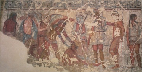 Il sacrificio di prigionieri (in questo caso troiani) dipinto all’interno della tomba François a Vulci (foto museo della Badia Vulci)
