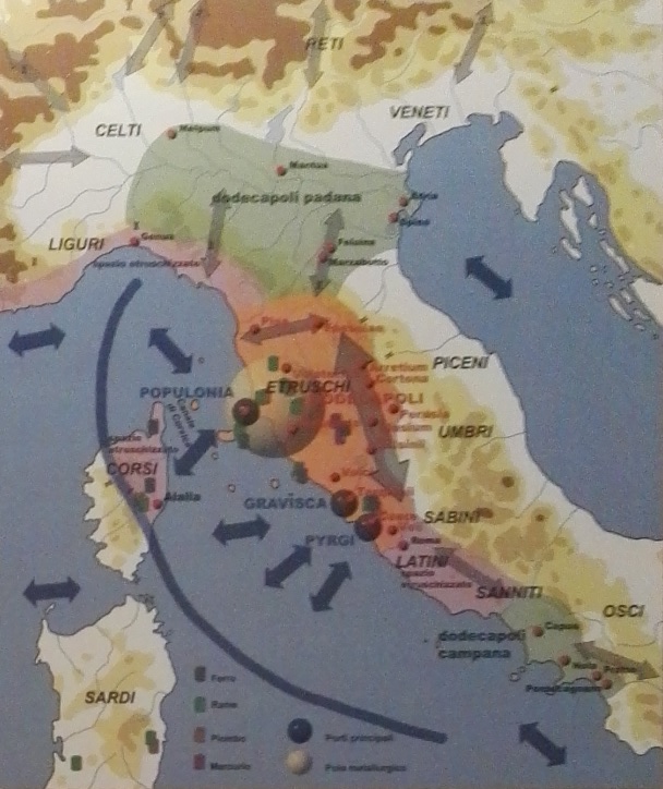 Il Mediterraneo all’inizio del VI sec. a.C. è un mare trafficato, solcato dalle navi commerciali di Fenici, Greci, Cartaginesi, Etruschi alla ricerca di minerali per forgiare il bronzo, favorendo i l contatto e lo scambio tra i diversi popoli. Lo si vede molto bene nel grande pannello che accoglie i visitatori annunciando il tema affrontato nella prima sala della mostra “Alalìa, la battaglia che ha cambiato la storia. Greci, Etruschi e Cartaginesi nel Mediterraneo del VI secolo a.C.” al museo civico Archeologico “Isidoro Falchi” di Vetulonia fino al 3 novembre 2019 (catalogo Ara edizioni), curata da Simona Rafanelli, direttore del museo di Vetulonia: capire quali erano gli attori alla vigilia della battaglia del mare Sardonio, quali erano le condizioni economiche e sociali dei popoli che vivevano all’epoca sulle sponde del Mediterraneo, quali erano le strutture disponibili. Così dopo aver conosciuto motivazioni e obiettivi della mostra-evento 2019 di Vetulonia, avere avuto conto dei reperti esposti e con quale allestimento (vedi https://archeologiavocidalpassato.com/2019/10/17/al-museo-archeologico-di-vetulonia-centocinquanta-reperti-da-corsica-sardegna-toscana-museo-etrusco-di-villa-giulia-e-dal-nucleo-tutela-della-guardia-di-finanza-raccontano-la-storica-battaglia-del/) ora immergiamoci fisicamente nel Mediterraneo di 2500 anni fa, e navighiamo lungo le sue coste, incrociando sulle frequentate rotte marittime navi commerciali e militari. Basta scorrere i grandi pannelli che si dipanano lungo le pareti intervallati, agli angoli, a vetrine con oggetti significativi sui temi affrontati.