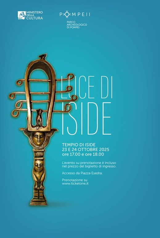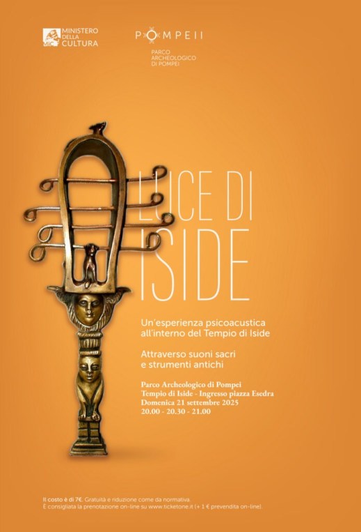 “Luce di Iside”: nuovo appuntamento di fruizione meditativa del patrimonio archeologico, ispirato alla figura di Iside, presso il tempio dedicato alla dea nell’antica città di Pompei, mercoledì 23 e giovedì 24 ottobre 2025. In due turni di visita alle 17 e alle 18 su prenotazione fino a esaurimento posti su www.ticketone.it, ripropone, dopo il positivo riscontro del primo appuntamento di settembre, un percorso attraverso suoni sacri e “magici”, con strumenti musicali antichi ricostruiti, per un’esperienza sensoriale psicoacustica. I visitatori saranno accolti dagli esperti musicisti del gruppo Synaulia che da diversi anni studiano e ripropongono musica e danze tipiche dell’antica Roma Imperiale e parteciperanno a un percorso all’interno del santuario, accompagnati da musiche, danze, oltre che da profumi di incensi, utilizzati durante gli antichi riti. Il culto di Iside, divinità egizia dispensatrice di vita, si diffuse nel Mediterraneo dal III secolo a.C. e trovò a Pompei un terreno fertile, coinvolgendo ogni ceto sociale. Il tempio, scavato nel 1764 e ritrovato quasi intatto, ha ispirato artisti come Mozart, che lo visitò nel 1770, influenzando le scenografie del “Flauto Magico”. L’esperienza non intende ricostruire filologicamente una cerimonia dell’epoca; piuttosto, si pone come un tentativo di ricreare l’incanto racchiuso nella musica antica quale chiave ritualizzata all’inconscio individuale e collettivo nelle sue accettazioni storiche. L’evento su prenotazione è incluso nel prezzo del biglietto di ingresso. Accesso da Piazza Esedra.