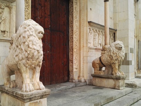 I due leoni antichi riutilizzati da Lanfranco come stilofori del protiro del duomo di Modena (foto Graziano Tavan)
